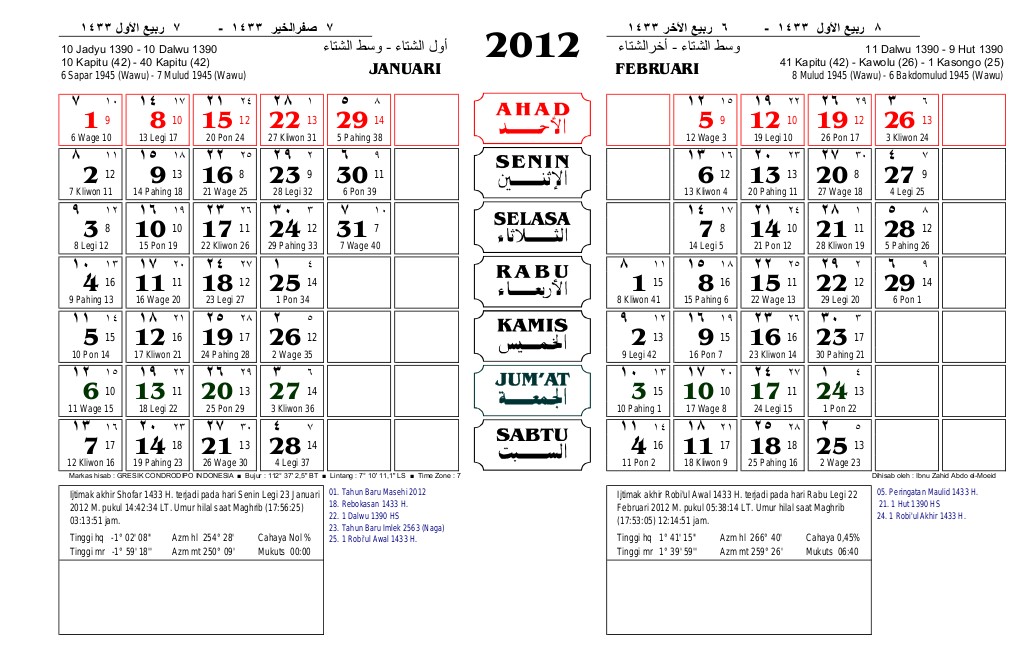 Sejarah kalender hijriah dan transformasinya menjadi penanggalan … Download desain kalender 2022 gratis, lengkap dengan penanggalan hijriyah dan jawa, serta hari libur nasional dan cuti bersama. Unduh gratis dan lengkap template kalender full 12 bulan dengan beragam desain dan format lengkap. Sedangkan akhir tahun 2012 (masehi) bertepatan dengan tanggal 17 shofar 1434 (hijriyah), 17 sapar 1946 (jawa), 11s posya 1949 (candra), dan 11 kasa 1935 (surya). Adi, kuntara, sangara, dan sancaya.